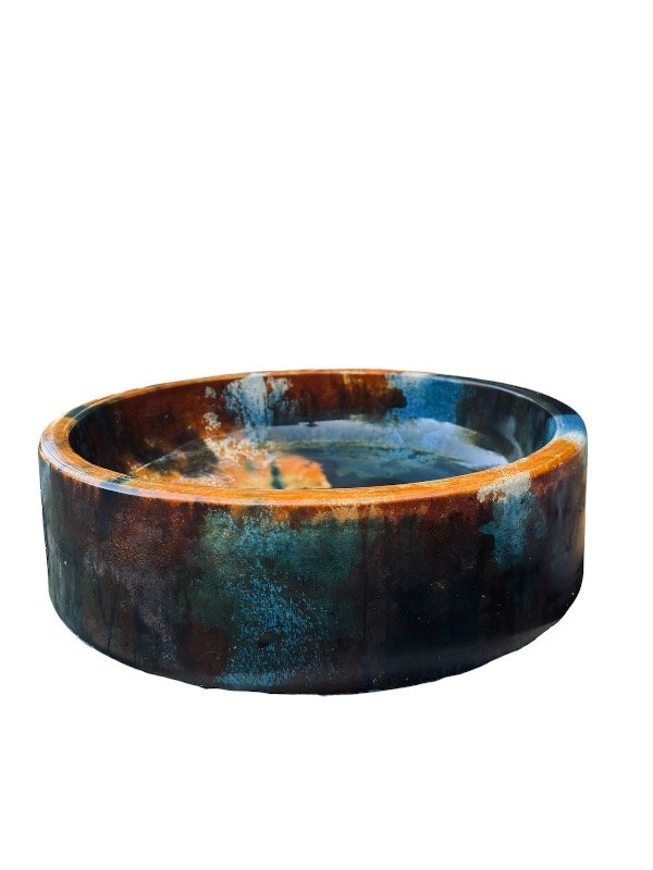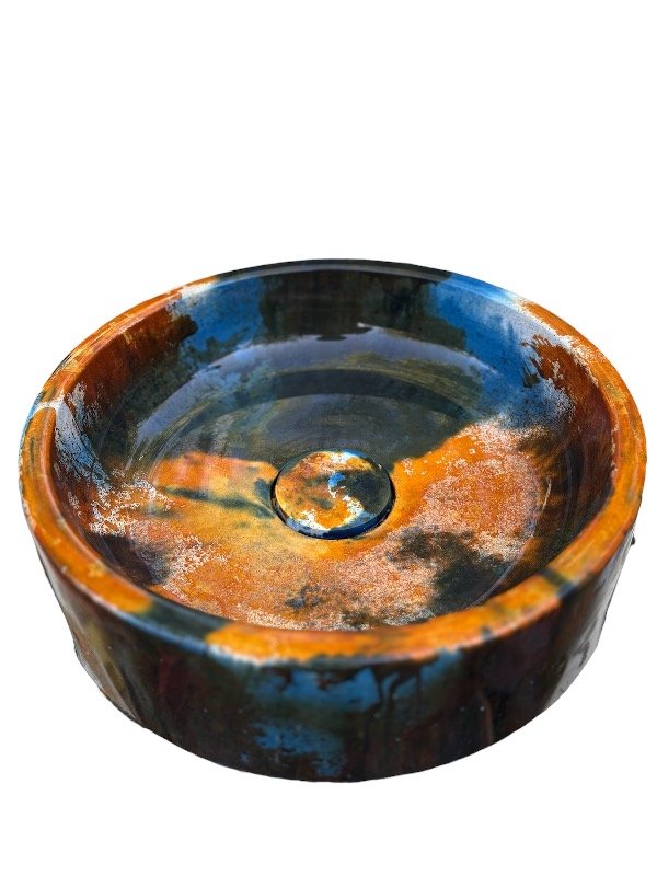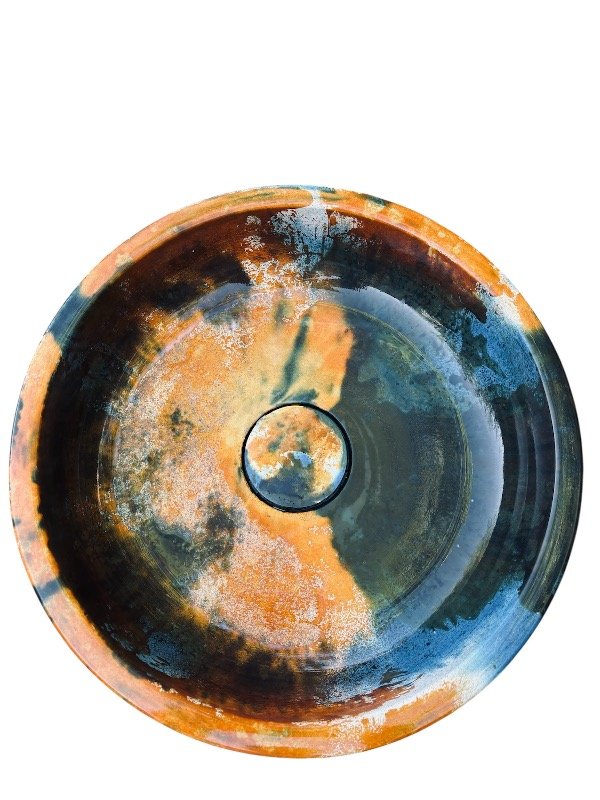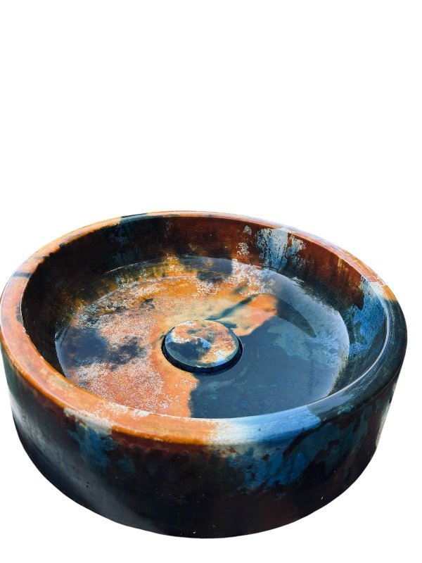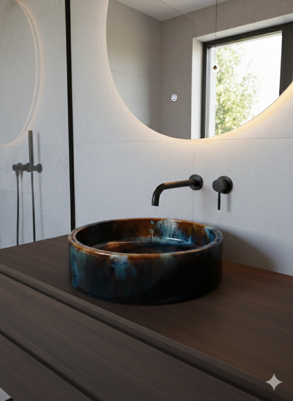 Esta bacha circular de la línea especial NC OXI es una pieza de autor, concebida como un objeto funcional de alto valor estético y material. Su presencia es contundente, con una estética orgánica y profunda que transforma la bacha en el centro visual del espacio.