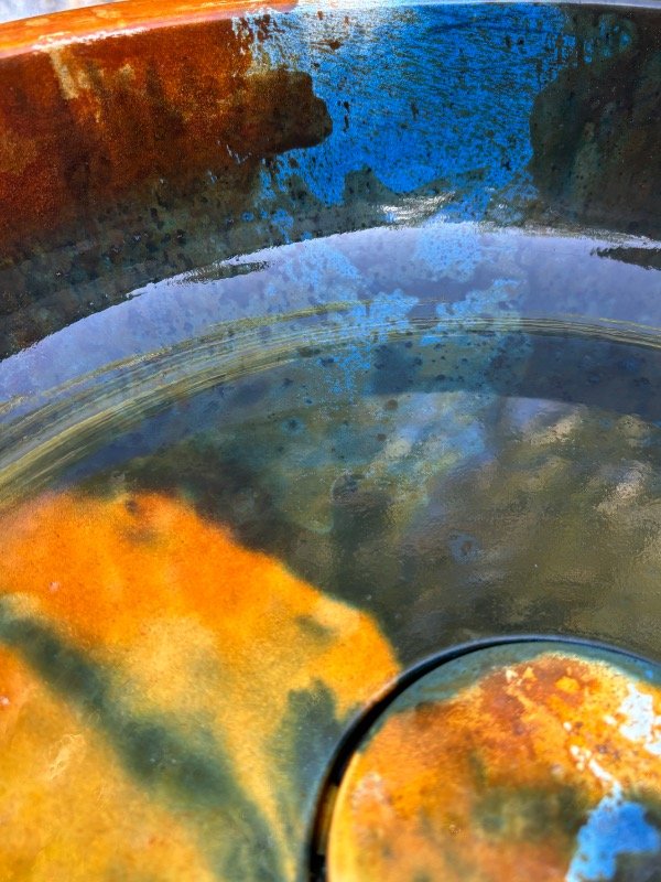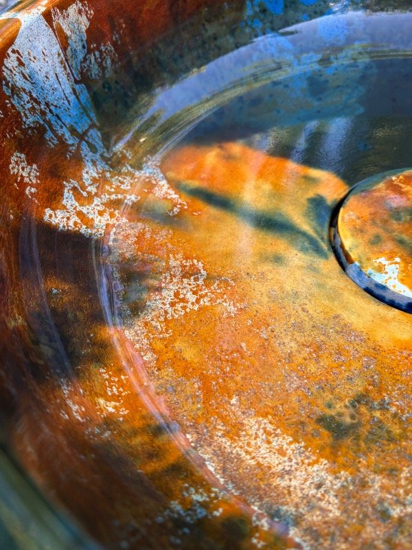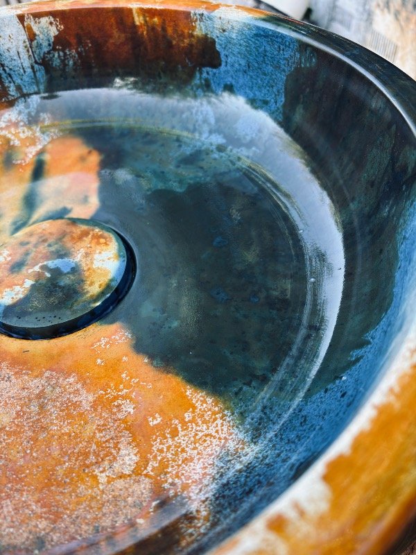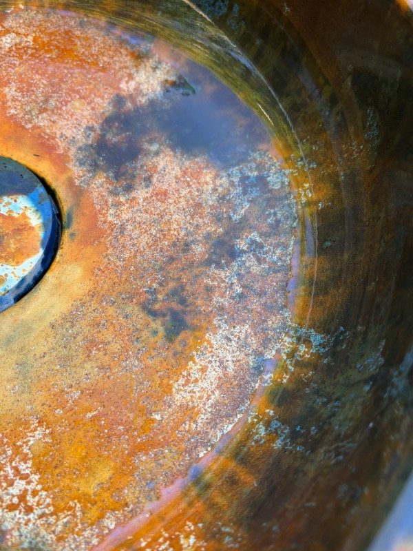 El interior de la bacha presenta una lectura visual rica y envolvente, con vetas y texturas que recuerdan a procesos naturales de oxidación, piedra y metal envejecido.
